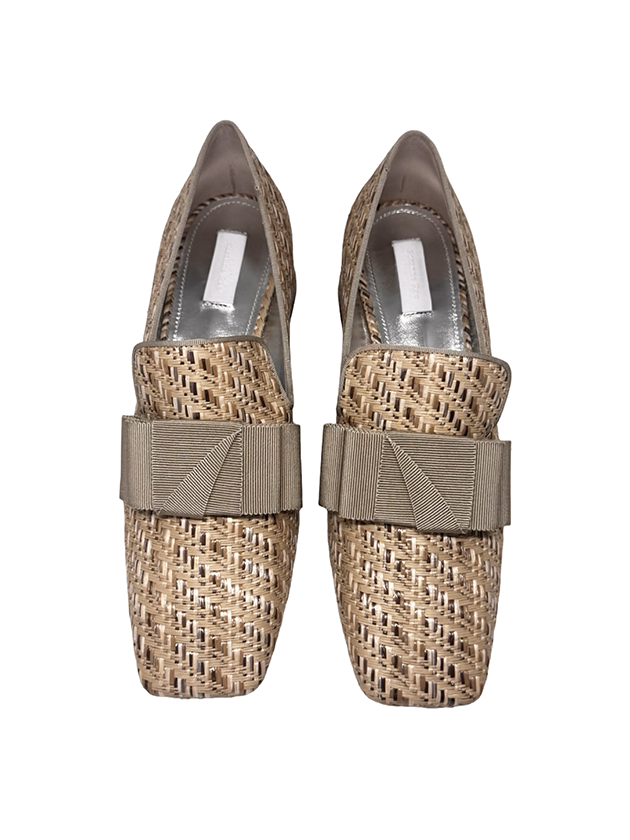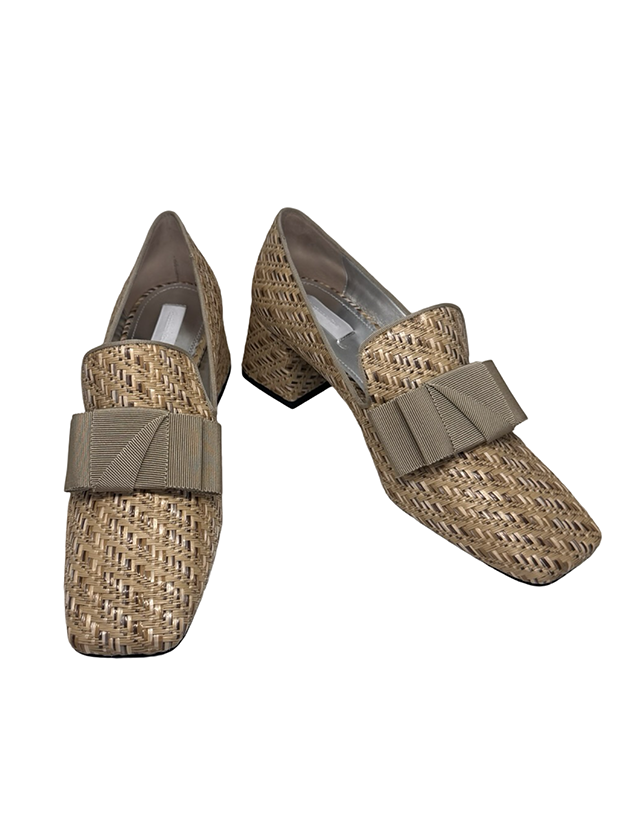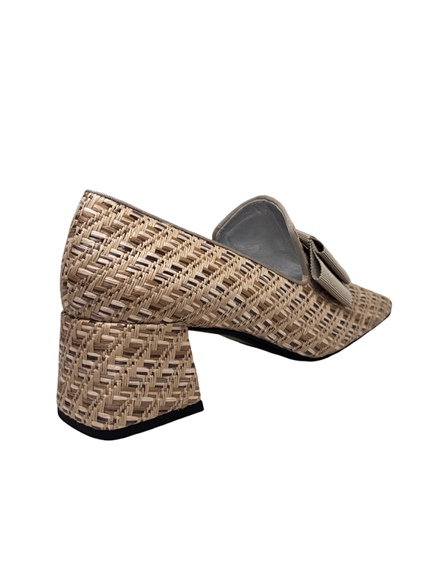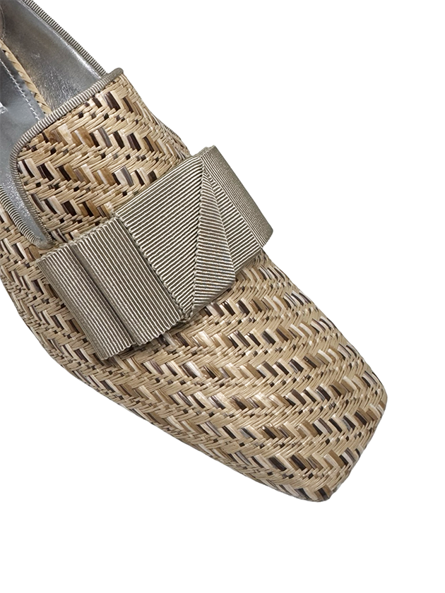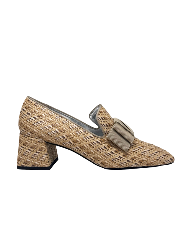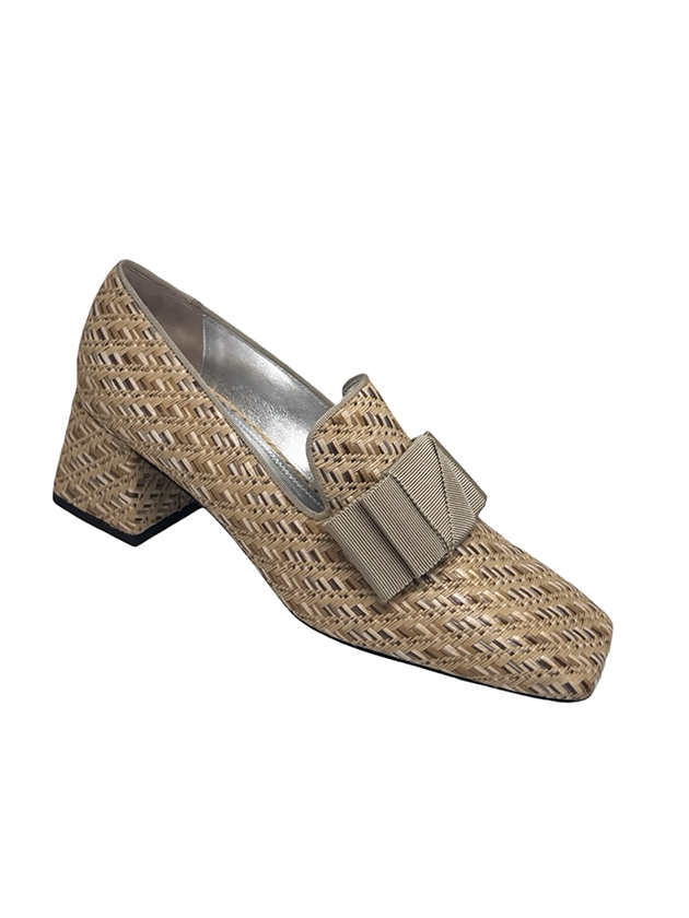 our classic smoking loafer in natural toned raffia. featuring a grey grosgrain bow and grosgrain trim. Signature wrapped 2" block heel
