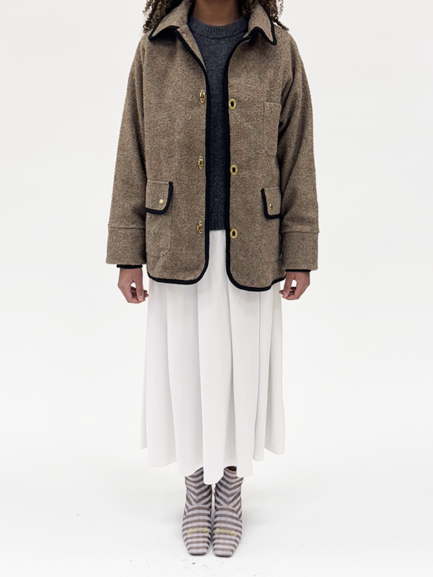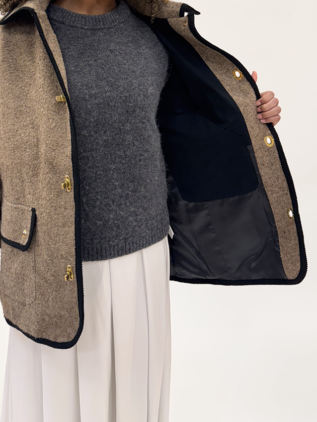 Casentino* wool field coat with brass twist lock buttons and brass snaps. Outer chest pocket and 2 flap packets. Double vent back with snaps. Ribbed cuffs and internal pockets on both sides. Fully lined - upper body in cotton, lower body and sleeves in viscose.