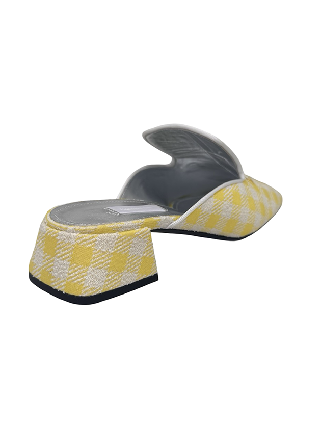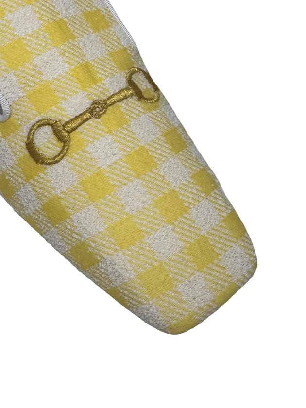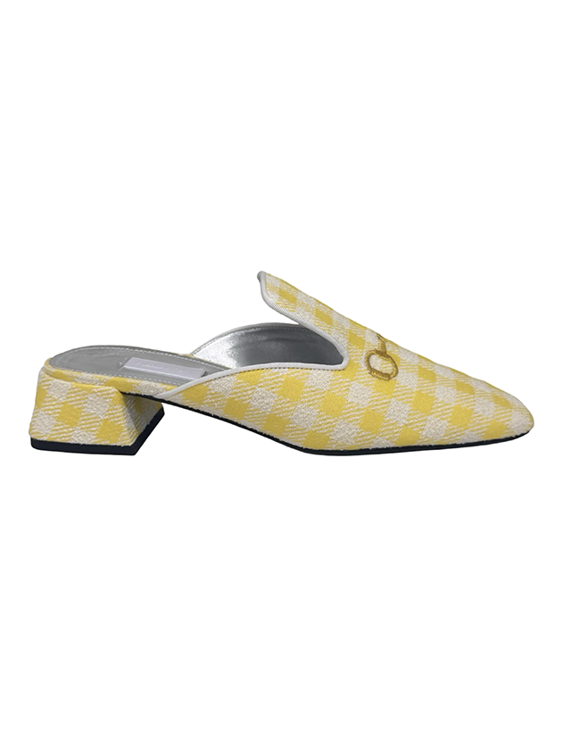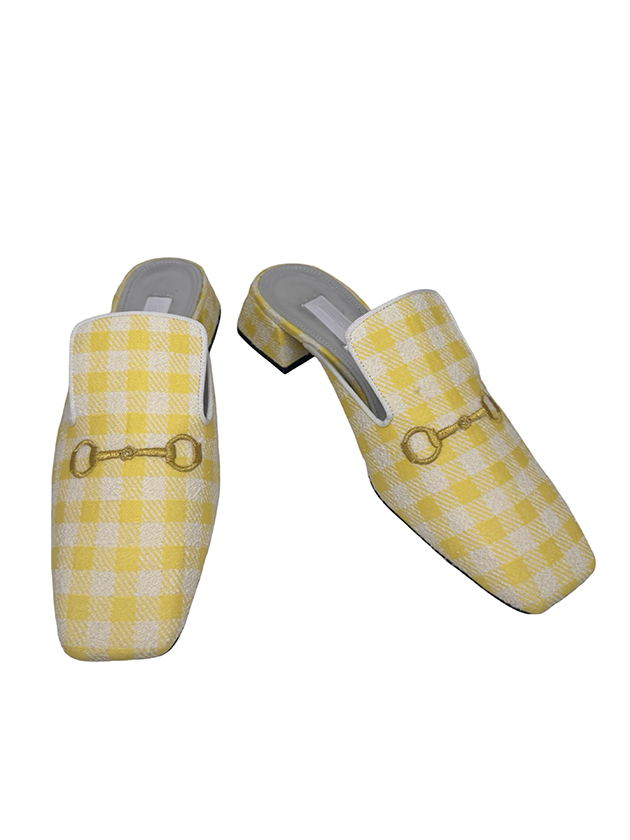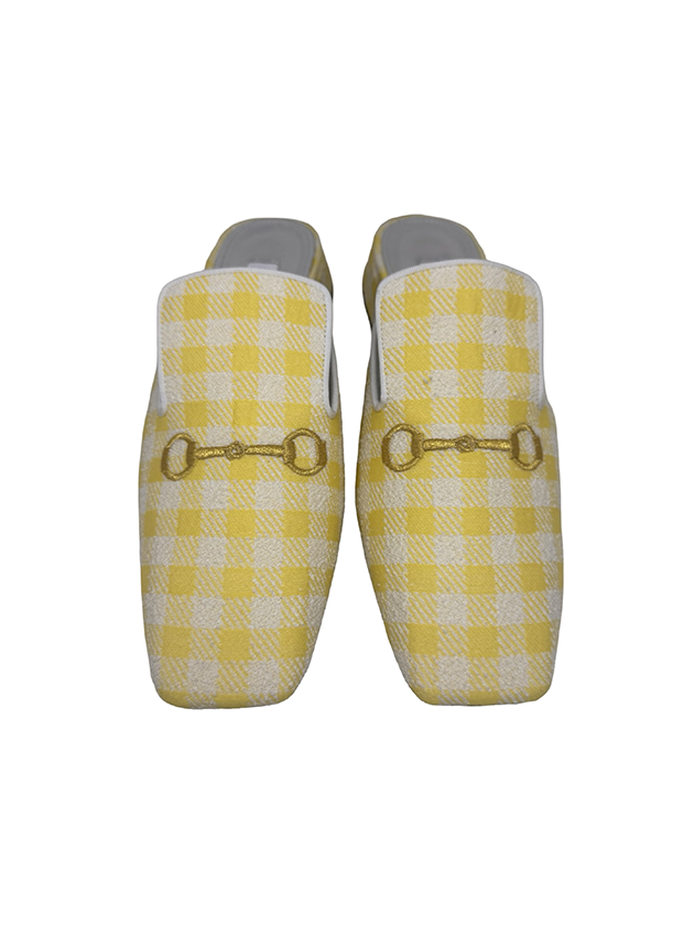 low heeled mule in yellow and white gingham with embroidered trompe l'oeil gold horsebit and grosgrain trim. Signature 1" block heel. Gold leather footbed.